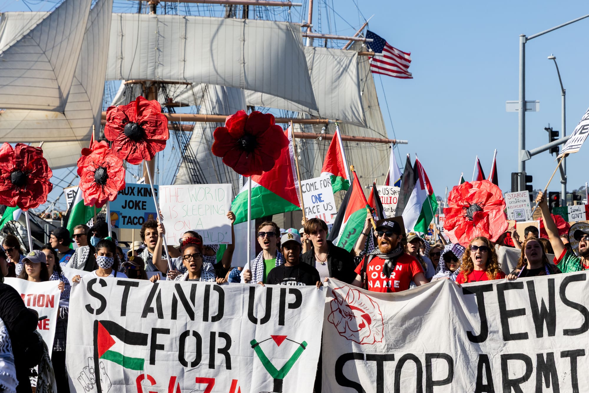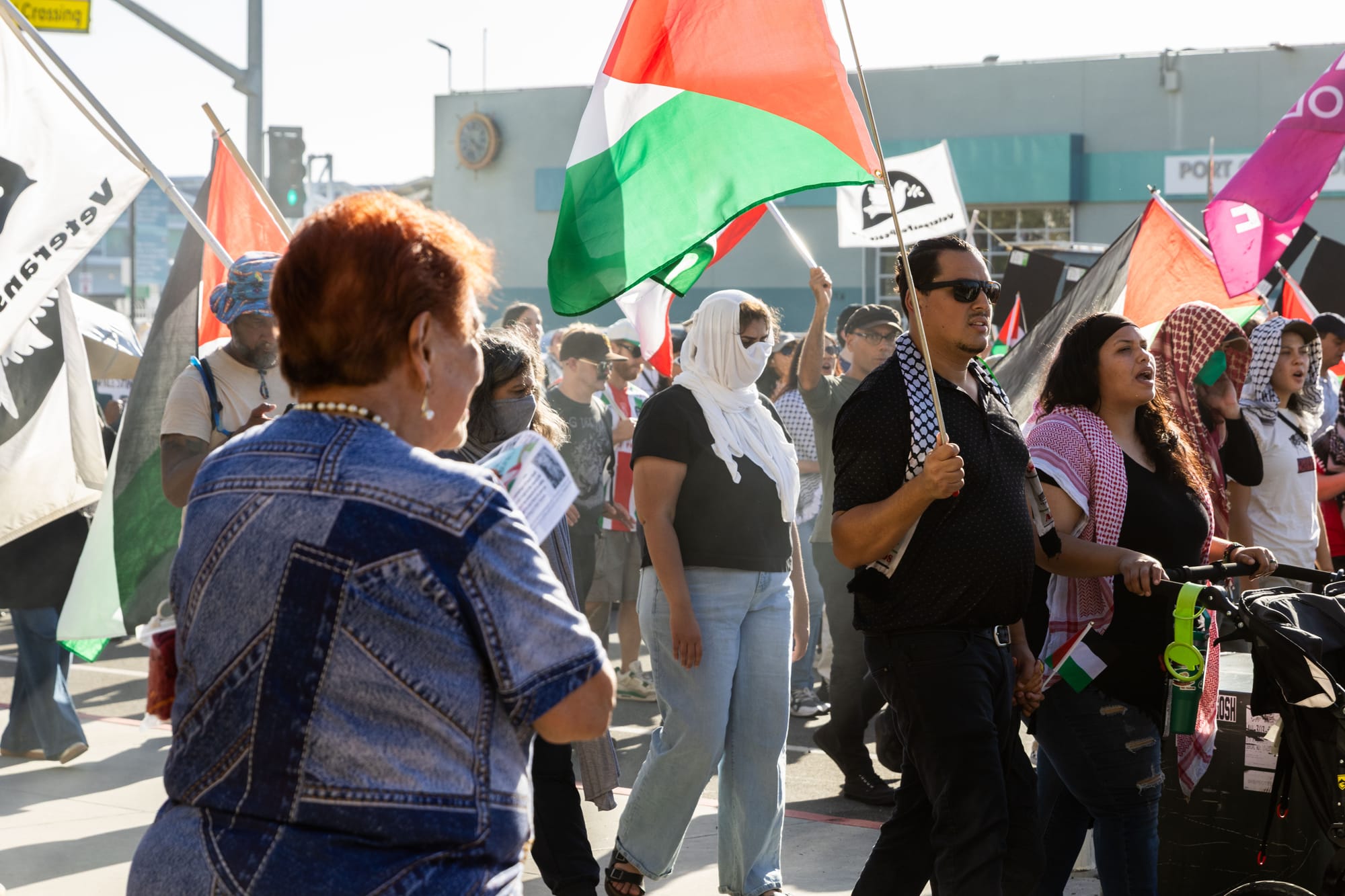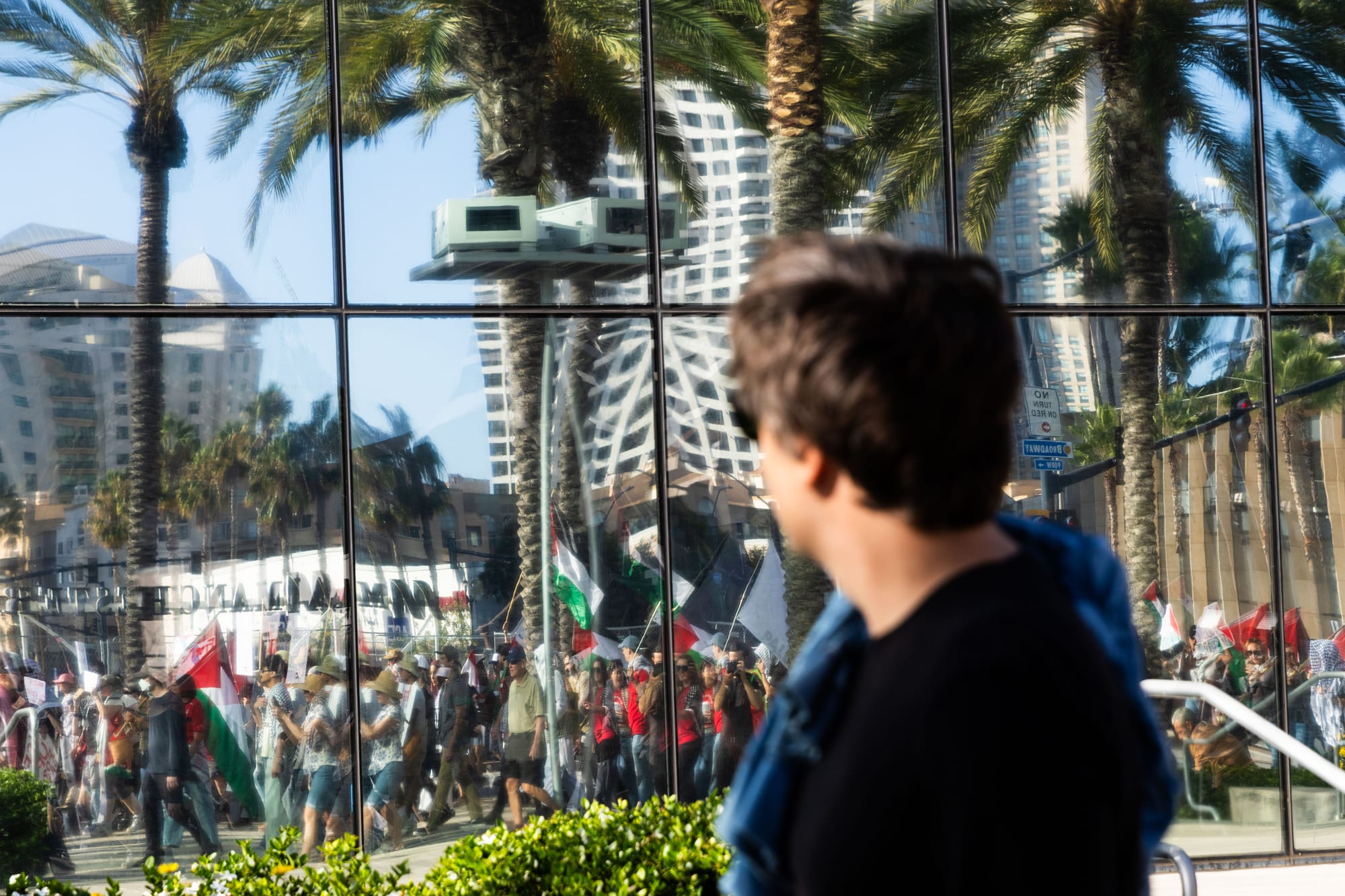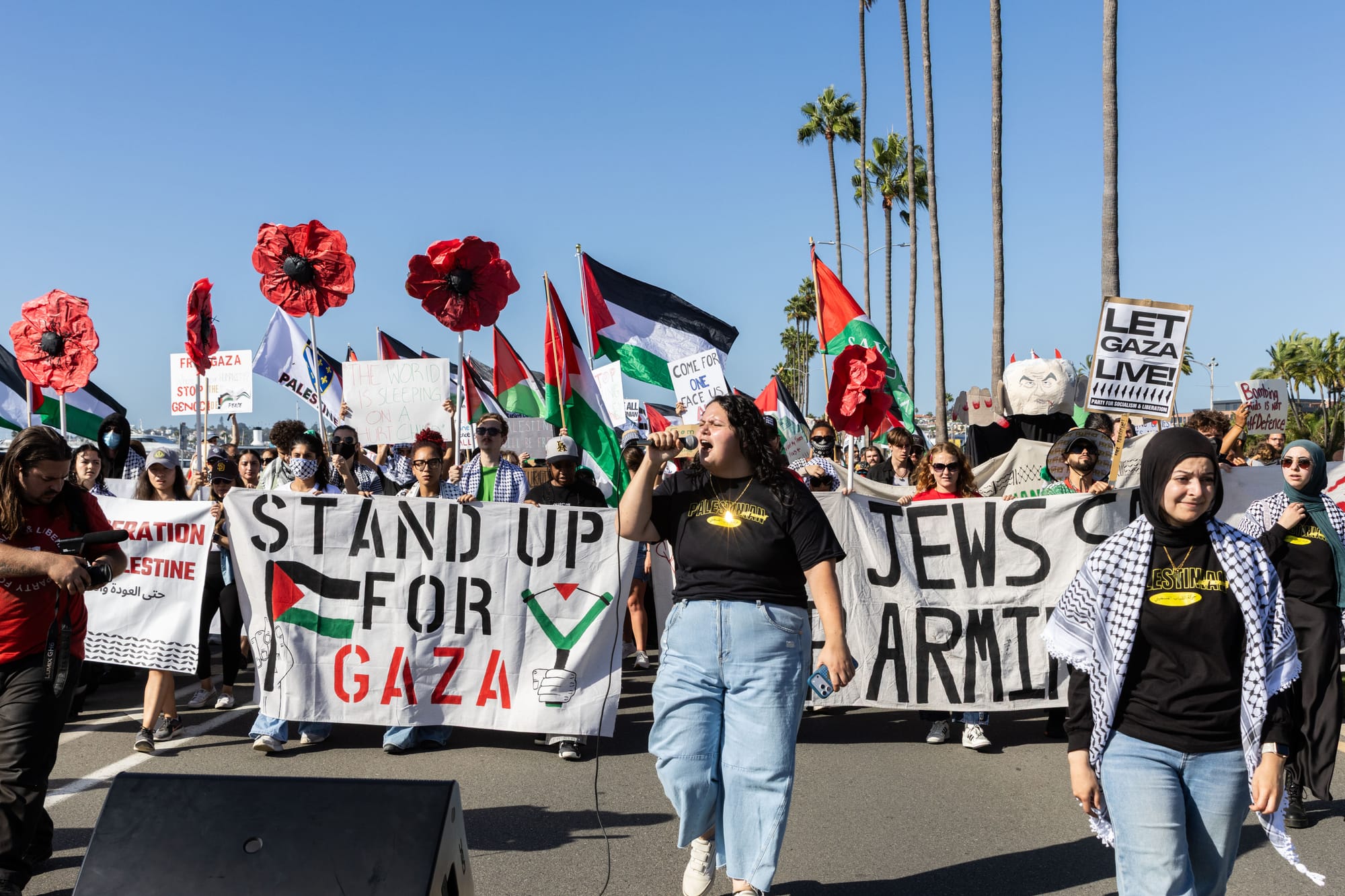 Following speeches, demonstrators marched along North Harbor Drive and Pacific Highway yelling chants like “World leaders grow a spine. Stop the killings. Stop the crime” and “Justice is our demand. No peace on stolen land.”