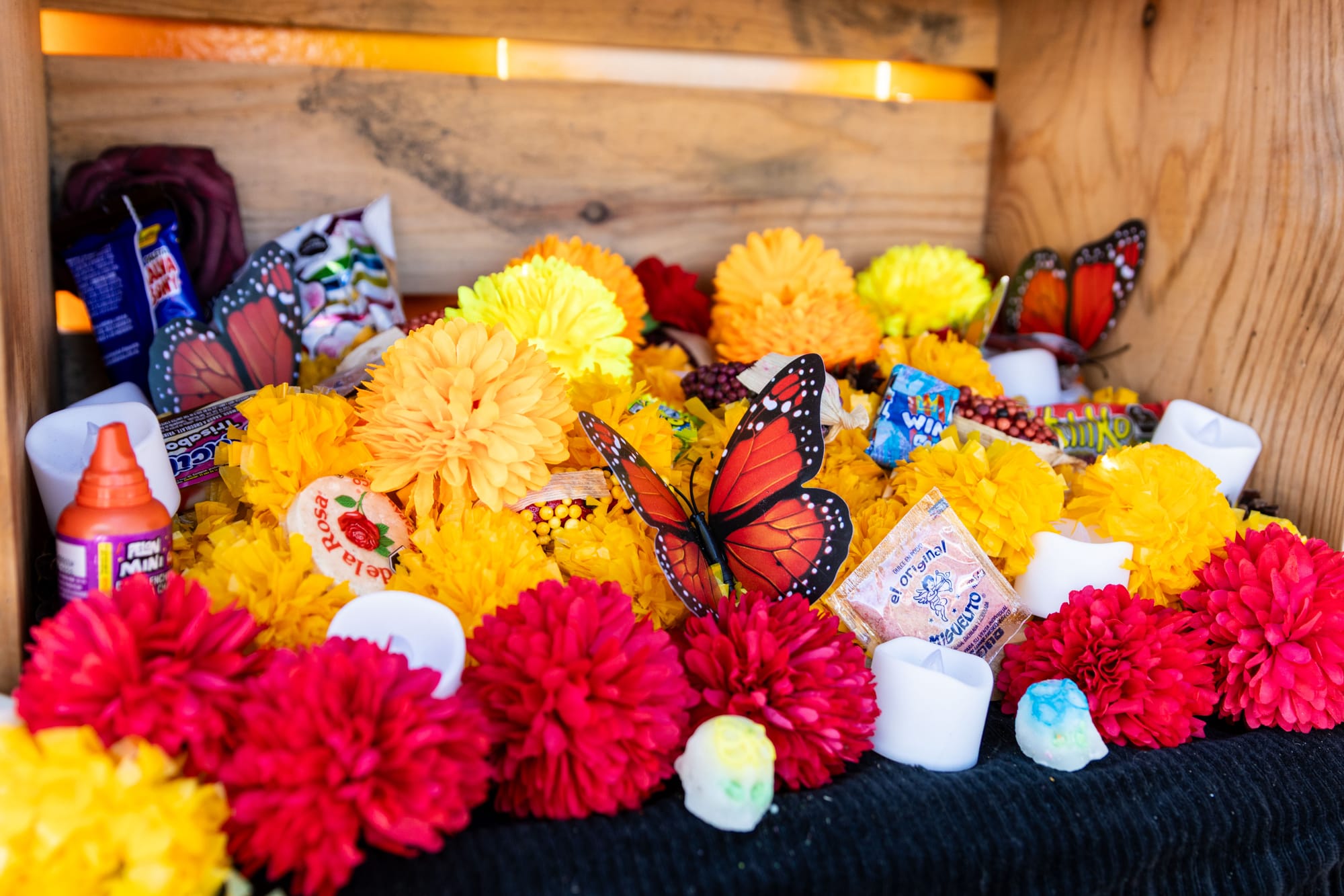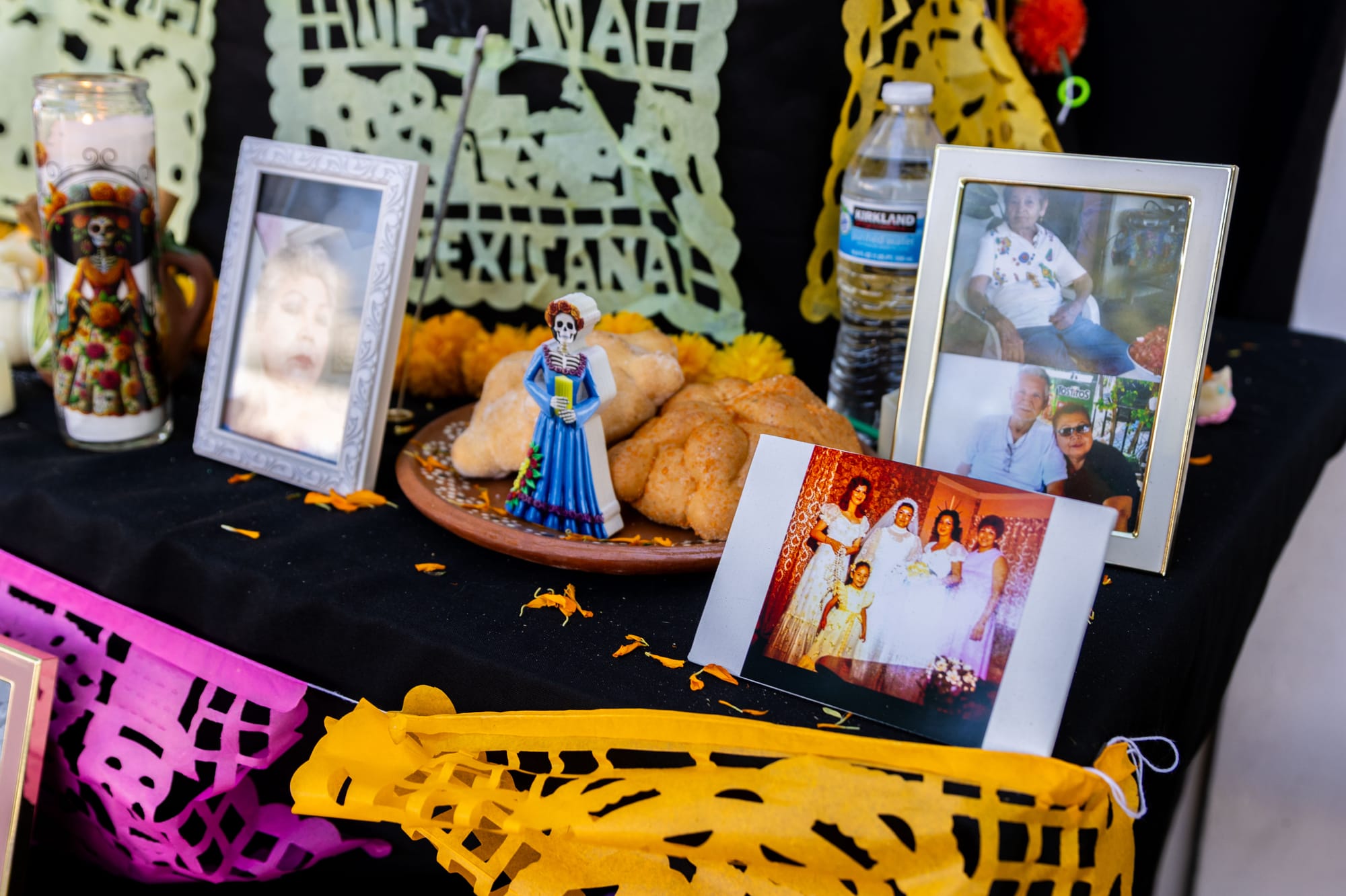 Several ofrendas were set up throughout Logan Avenue with pictures of people’s loved ones and popsicle sticks for people to write down the names of their loved ones who passed on to add to the public ofrenda display. Brittany Cruz-Fejeran/Daylight San Diego