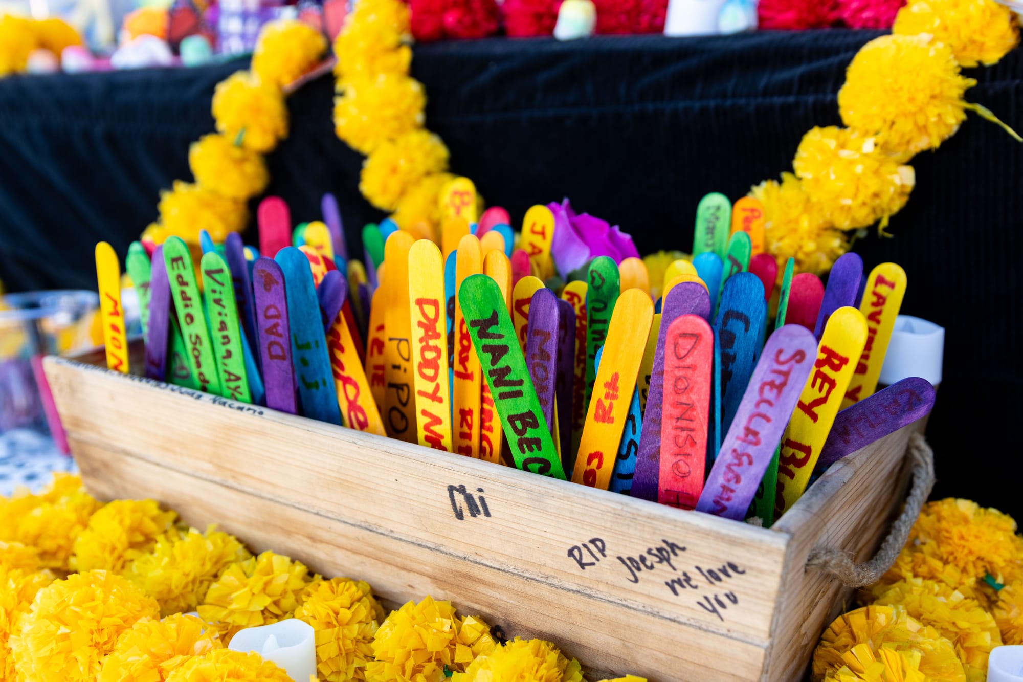 Several ofrendas were set up along Logan Avenue with pictures of people’s loved ones and popsicle sticks for people to write the names of their loved ones who have passed on to add to the public ofrenda display. Brittany Cruz-Fejeran/Daylight San Diego