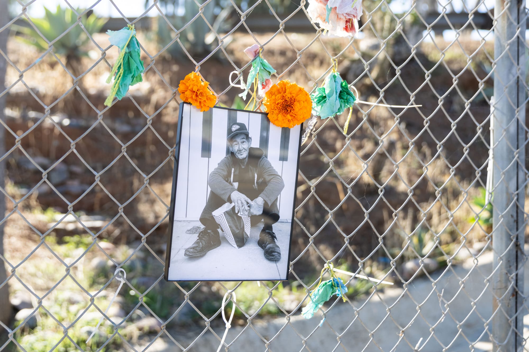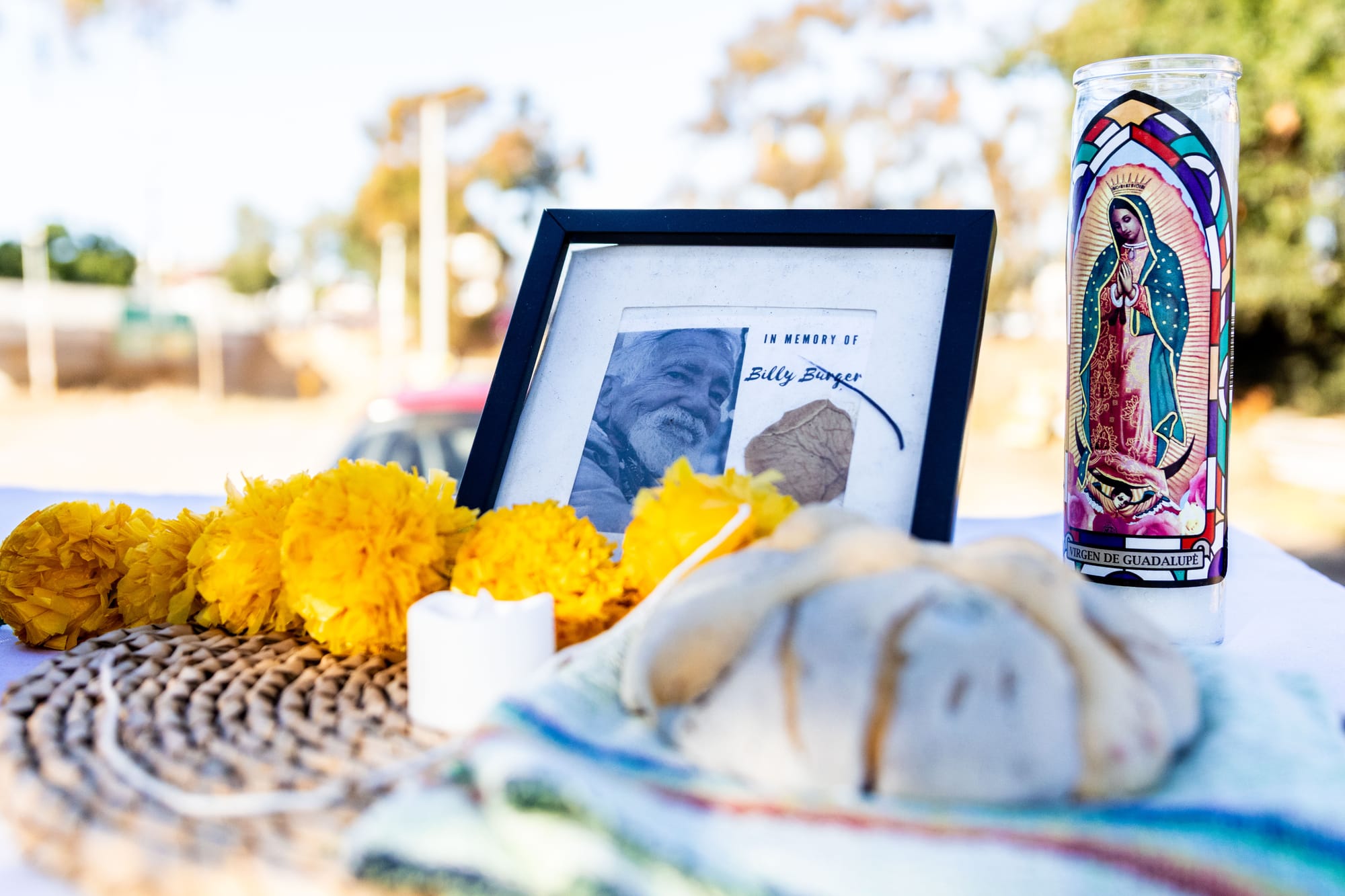 First photo: A photo of a man is zip-tied to a fence with marigolds and tissue paper flowers around it. Center photo: A small statue of a saint is positioned on a blanket in front of a lowrider car. Last photo: An ofrenda displays a photo of a man with a concha in front of it as an offering. Brittany Cruz-Fejeran/Daylight San Diego