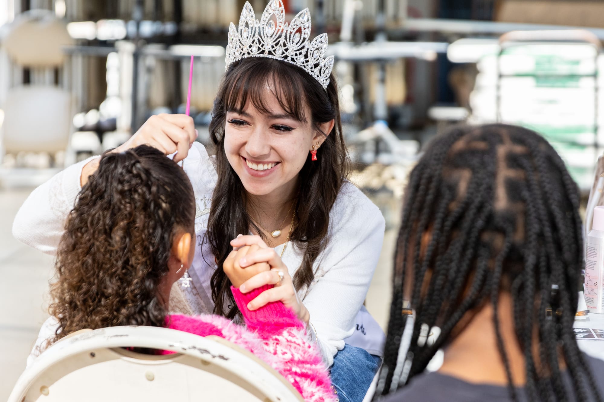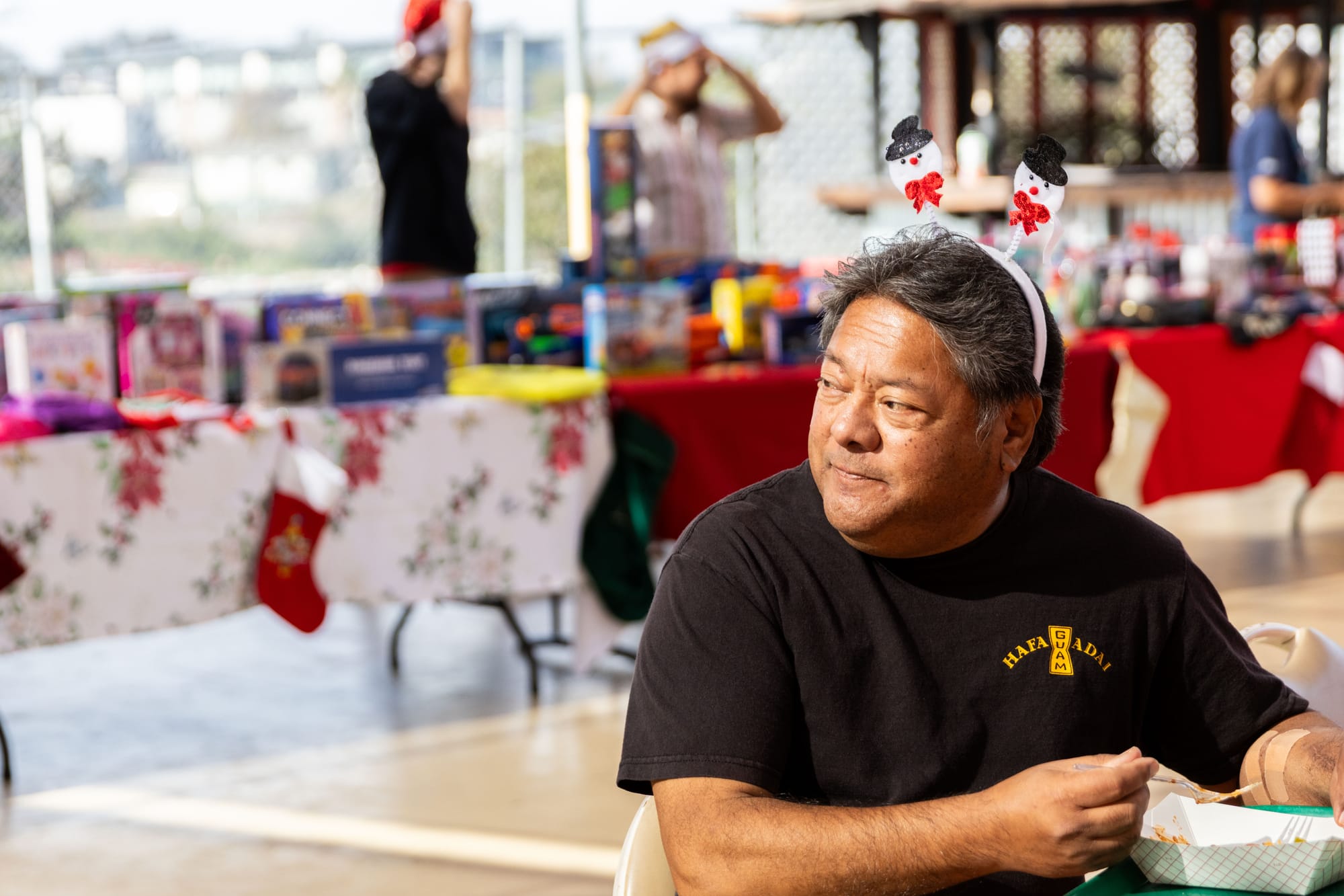 First: Volunteer Kerie Jones serves food to guests. Center: Sons and Daughters of Guam Club’s 2025 Royal Princess Vanessa Ann Wizner mans a facepainting station. Last: John Quichocho, assistant chair for the Sons and Daughters of Guam Club’s Youth Program, sits to eat at a table. Brittany Cruz-Fejeran/Daylight San Diego