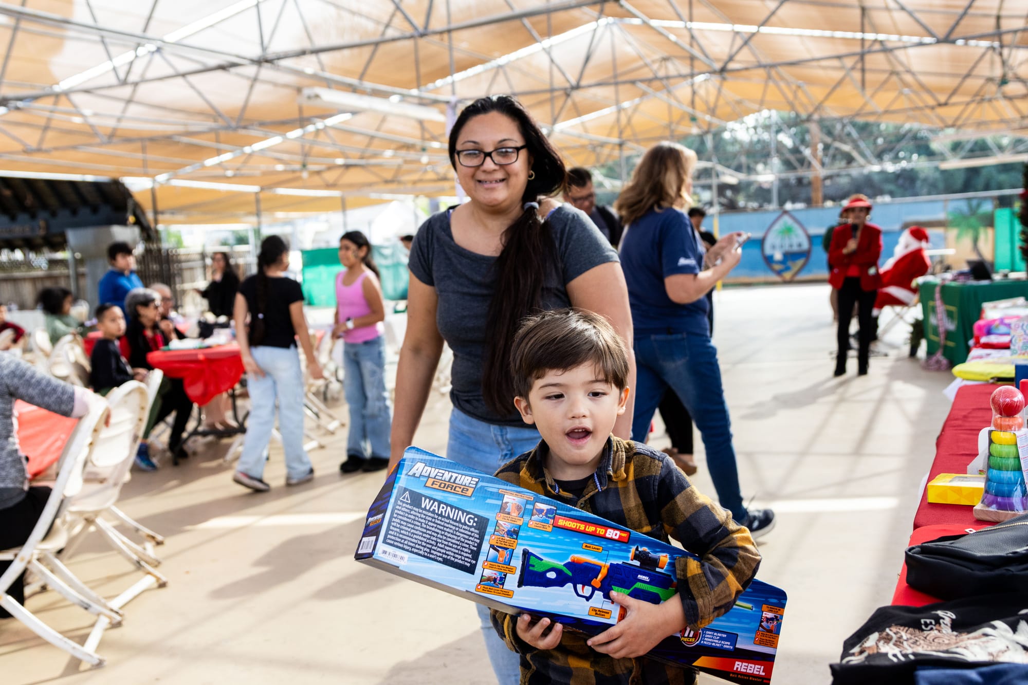 First: A little girl chooses a pink unicorn plushie to take home from the toy table. Center: Aliscia Gayosso watches her son Tobias while he holds his new Nerf gun. Last: Abbygail Gayosso (red shirt) holds up a Bubble Bliss Spa foot massager she wanted from the toys table during the Sons and Daughters of Guam Club’s Youth Program Christmas Party at its clubhouse in Lincoln Park on Saturday, Dec. 13, 2025. Brittany Cruz-Fejeran/Daylight San Diego
