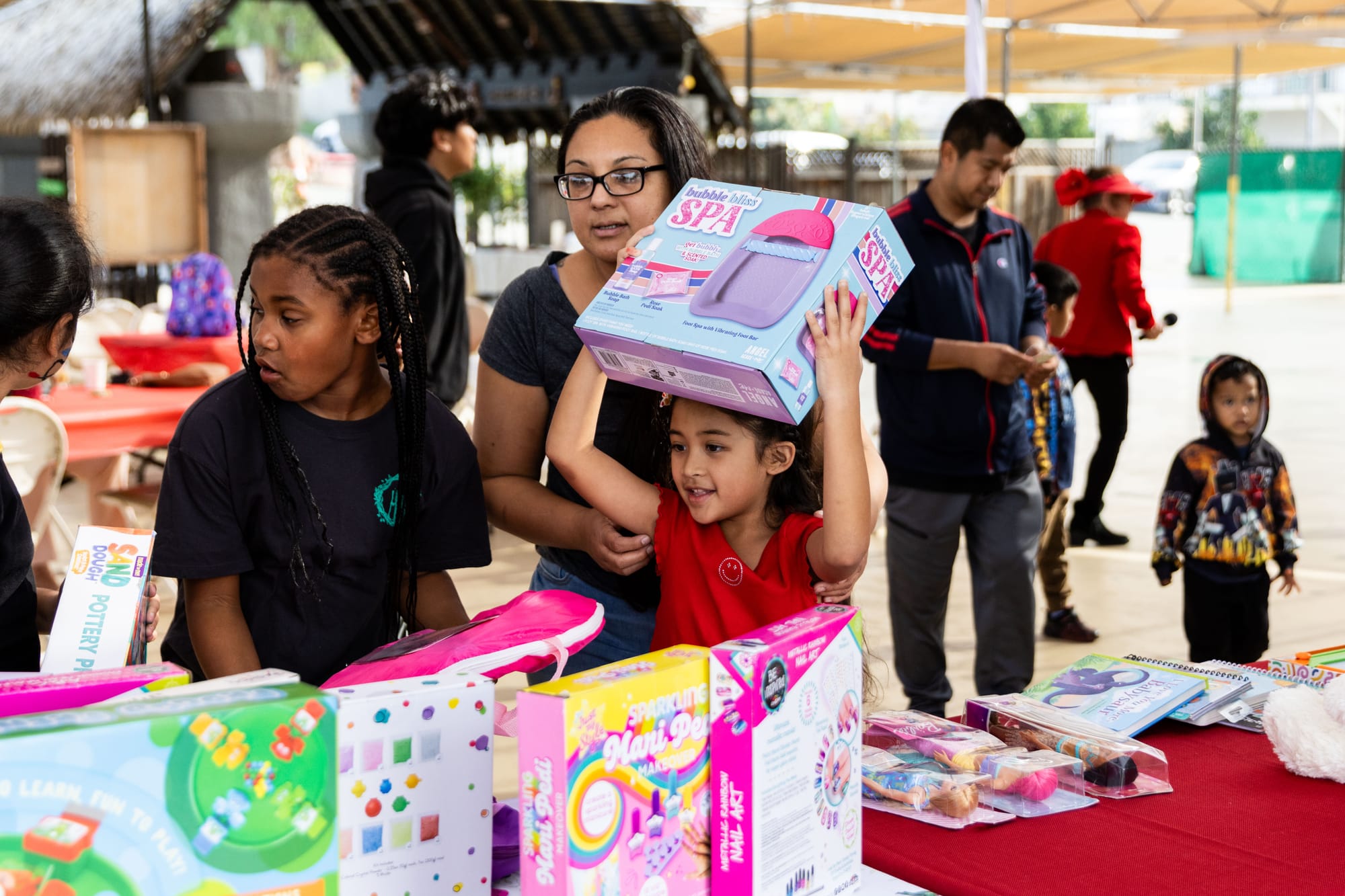 Aliscia Gayosso walked her son, Tobias, to the table, where he ran straight for a Nerf gun that was half his size. Her daughter, Abbygail, grabbed a Bubble Bliss Spa foot massager.