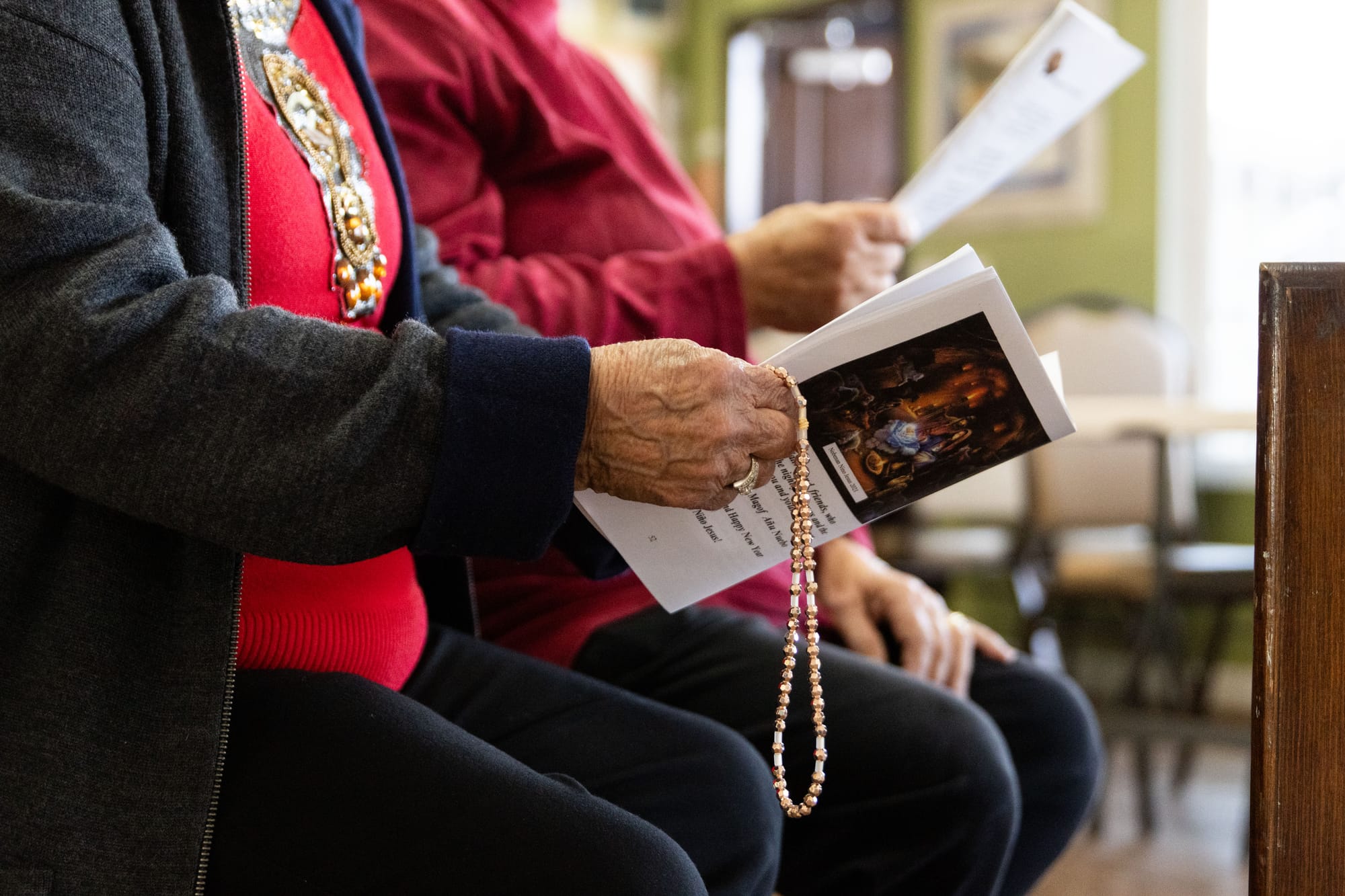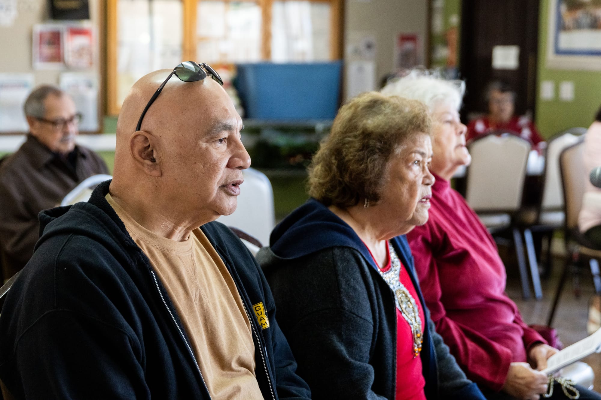 Antolin Taijeron, president of the Sons and Daughters of Guam Club, sits with his mother while reciting the rosary during the second day of the nine-day nobena during the club’s Youth Program Christmas Party at its clubhouse in Lincoln Park on Saturday, Dec. 13, 2025. Brittany Cruz-Fejeran/Daylight San Diego