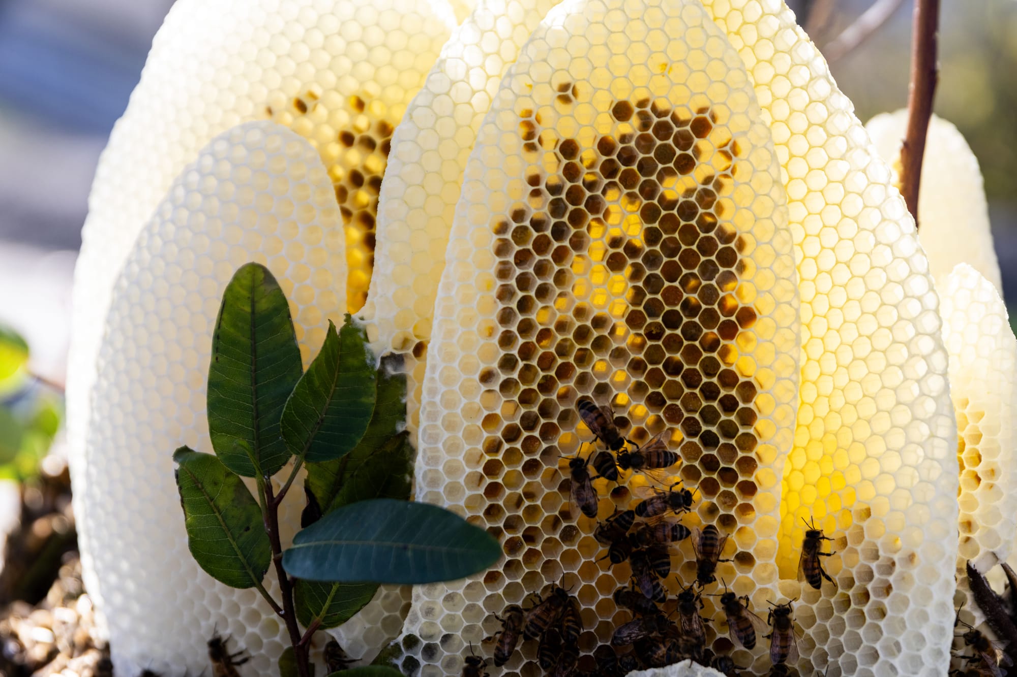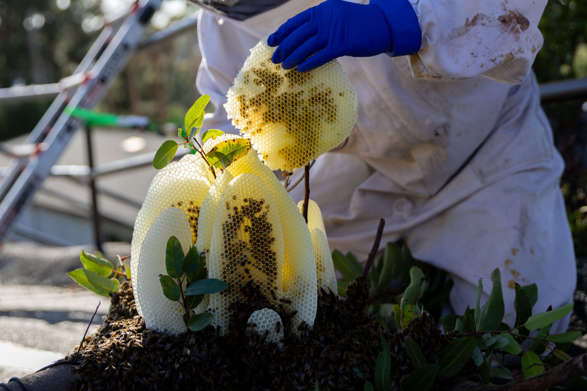 As Luong prepared a ladder to access the hive, his fiancée Grimaldi blew smoke at it, making the bees think there’s a fire and that their week-old home was no longer safe. Once the bees slowly fly away from the smoke, they reveal a chandelier of intricate honeycomb panels, all different sizes shining a pastel yellow against the afternoon sun.