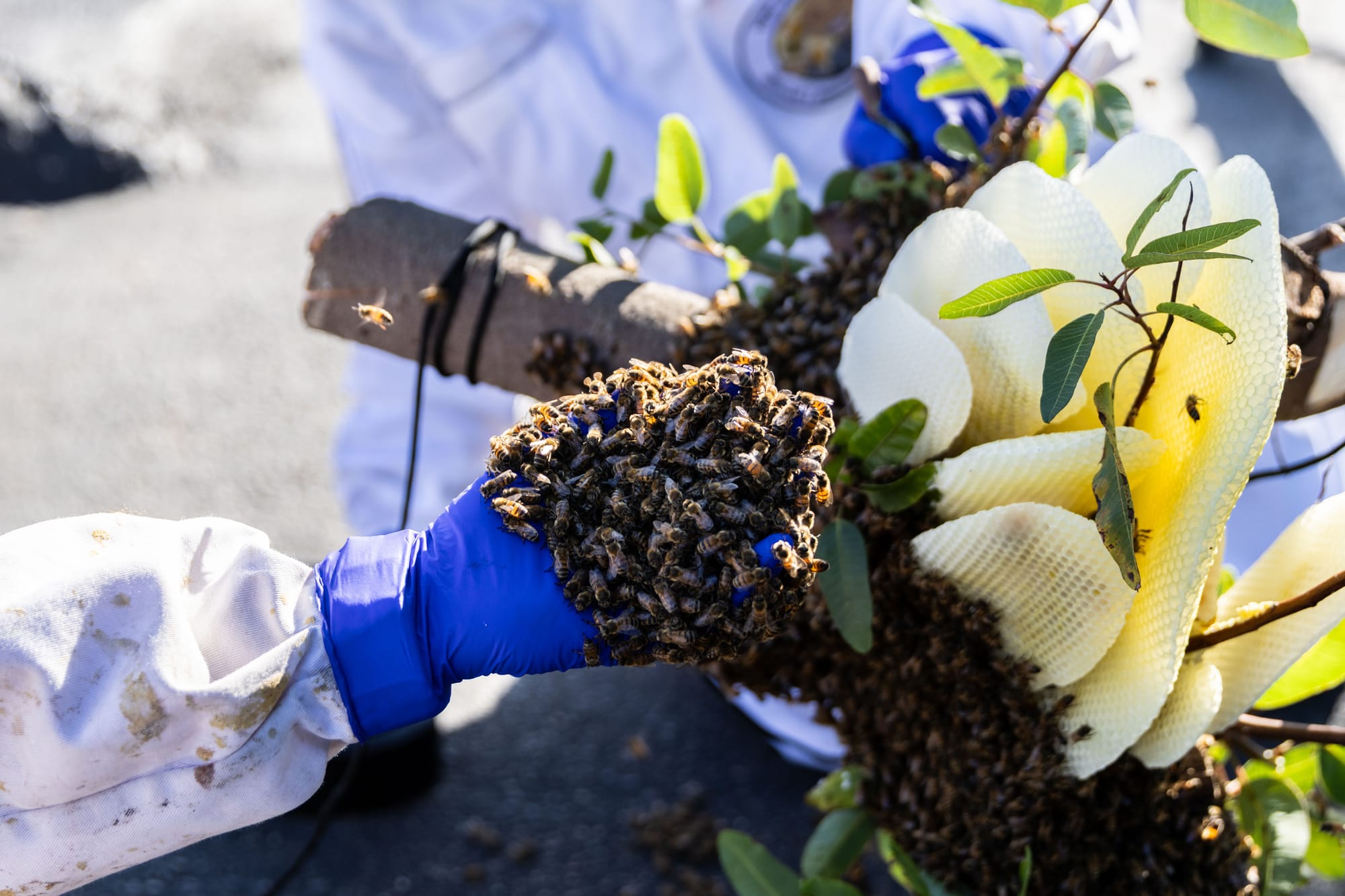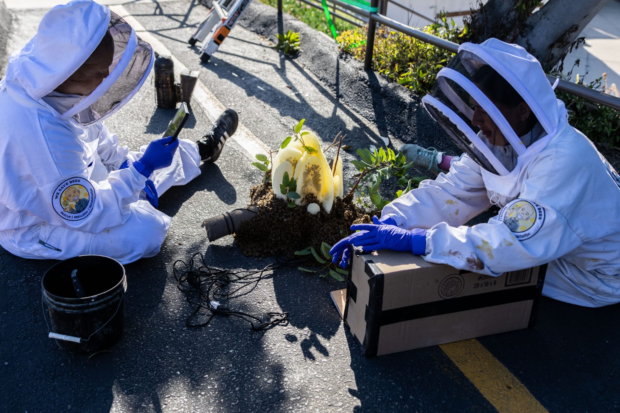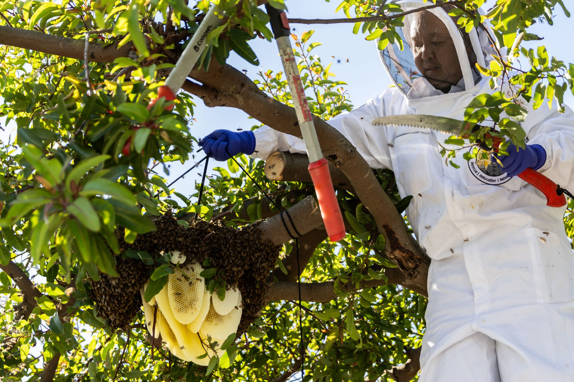 At a rescue job, it’s the bees that set the tone. On Sunday, Grimaldi and Luong cut the branch with the hive and found the honeycomb with the most eggs in it to put into a frame that sits in a cardboard box.